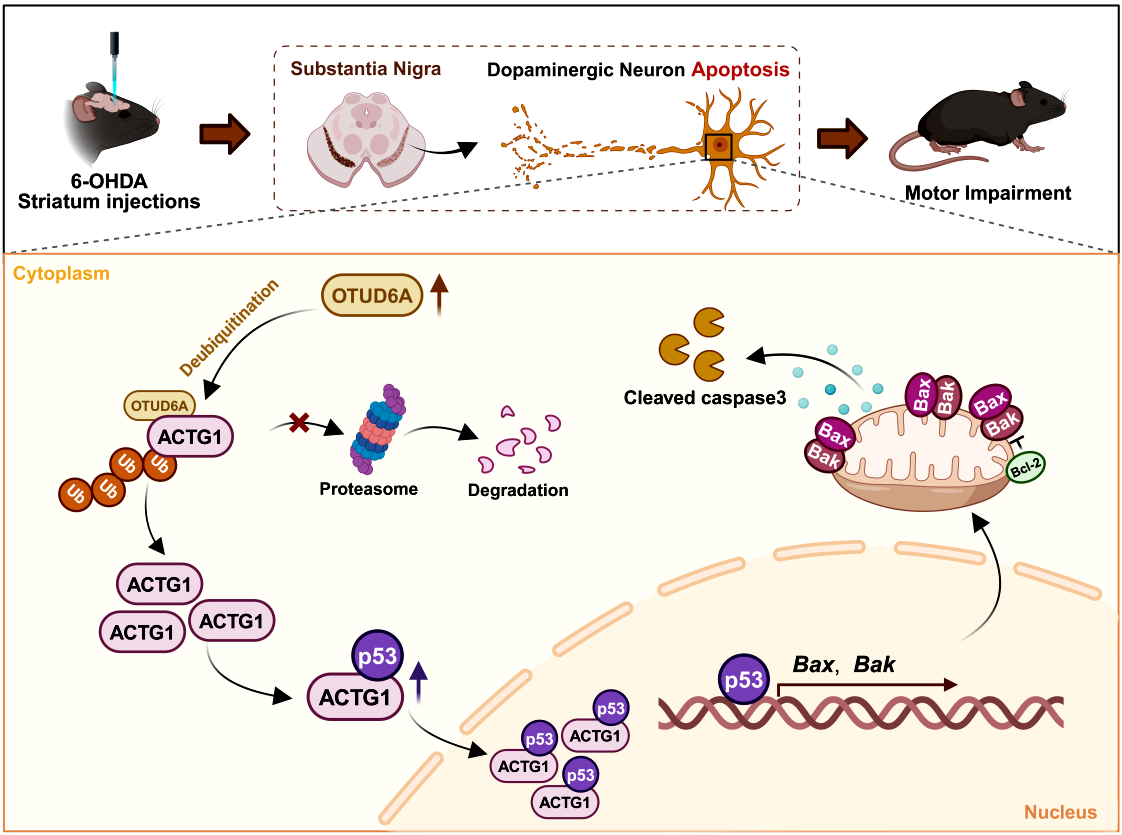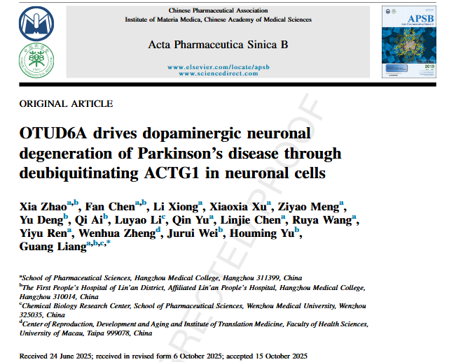 近日,杭州医学院药学院梁广/赵霞课题组在药学领域权威期刊《Acta Pharmaceutica Sinica B》(中科院一区; IF=14.7)上在线发表题为“OTUD6A Drives Dopaminergic Neuronal Degeneration of Parkinson's Disease through Deubiquitinating ACTG1 in Neuronal Cells”的研究论文。该研究在国际上首次揭示了去泛素化酶OTUD6A调控PD进展的分子机制,阐明其通过特异性识别并结合ACTG1的8–181氨基酸区域,靶向切割其K48连接的多聚泛素链,从而增强ACTG1在神经元内的蛋白稳定性。进一步机制研究发现,稳定表达的ACTG1可与p53相互作用,促进p53核转位并激活下游促凋亡基因转录,最终导致多巴胺能神经元凋亡。该工作系统解析了“OTUD6A-ACTG1-p53”信号轴在PD发病过程中的关键作用,不仅为理解去泛素化修饰在神经退行性疾病中的调控功能提供了新视角,也为发展以OTUD6A为靶点的新型PD治疗策略奠定了理论基础。